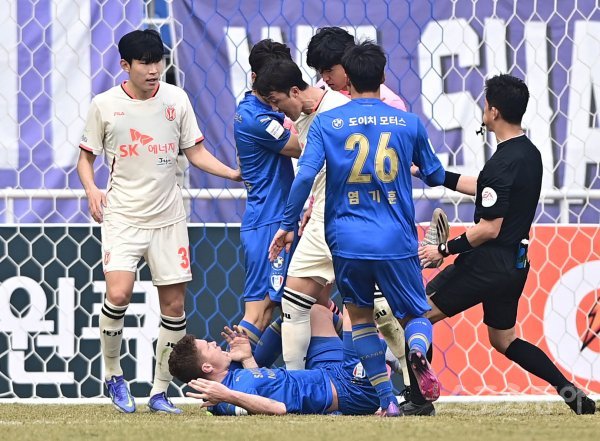 1일 수원월드컵경기장에서 열린 ‘하나원큐 K리그1 2022’ 수원 삼성과 제주 유나이티드의 경기에서 제주 김오규가 수원 그로닝의 반칙에 흥분하고 있다.