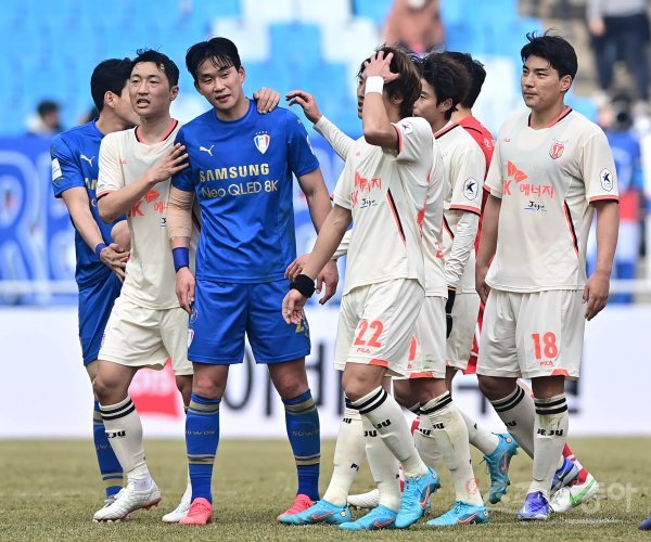 1일 수원월드컵경기장에서 열린 ‘하나원큐 K리그1 2022’ 수원 삼성과 제주 유나이티드의 경기에서 제주에 0-1로 패한 수원 이한도와 제주 선수들이 이야기를 하고 있다.