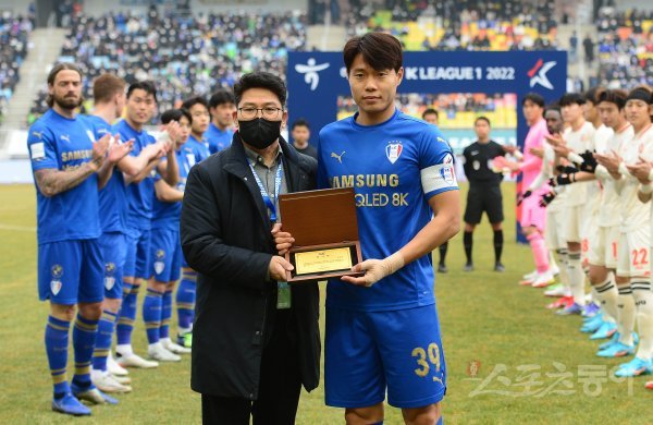 1일 수원월드컵경기장에서 열린 ‘하나원큐 K리그1 2022’ 수원 삼성과 제주 유나이티드의 경기에서 유환모 수원 의무팀장이 민상기와 기념 촬영을 하고 있다.