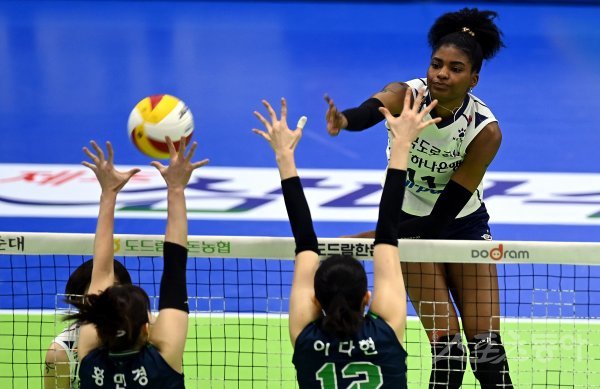 1일 경기도 수원체육관에서 ‘2021-2022 도드람 V리그’ 수원 현대건설과 김천 한국도로공사의 여자부 경기가 열렸다. 한국도로공사 켈시가 현대건설 블로커를 피해 스파이크를 날리고 있다.