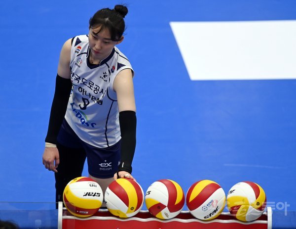 1일 경기도 수원체육관에서 ‘2021-2022 도드람 V리그’ 수원 현대건설과 김천 한국도로공사의 여자부 경기가 열렸다. 한국도로공사 박정아가 코로나19 여파로 인해 직전 서브볼을 선택하고 있다.