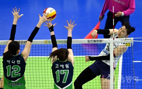 1일 경기도 수원체육관에서 ‘2021-2022 도드람 V리그’ 수원 현대건설과 김천 한국도로공사의 여자부 경기가 열렸다. 한국도로공사 박정아가 현대건설 블로커를 피해 스파이크를 날리고 있다.