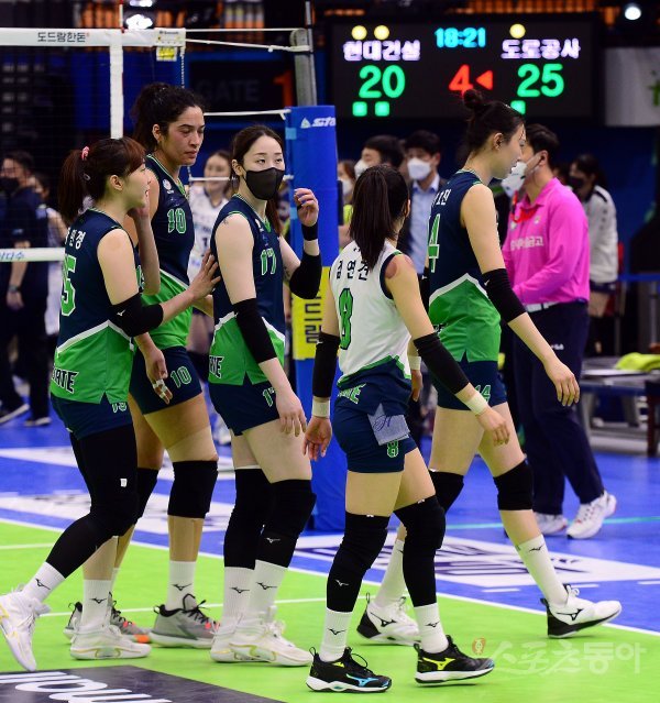 1일 경기도 수원체육관에서 ‘2021-2022 도드람 V리그’ 수원 현대건설과 김천 한국도로공사의 여자부 경기가 열렸다. 현대건설이 4세트를 패하며 우승 결정에 실패한 뒤 선수들이 아쉬워하고 있다.