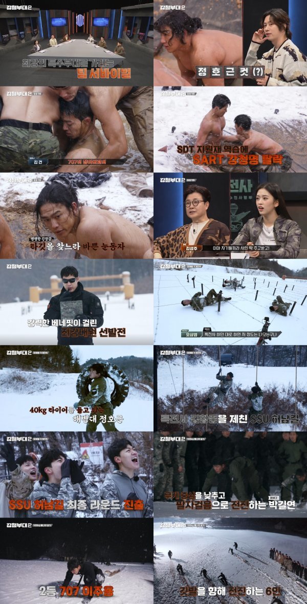 이어진 두 번째 미션 ‘장애물 각개전투’에서 최용준과 707 이주용, 구성회는 우월한 체력으로 초고난도의 장애물을 거침없이 통과해 감탄을 불러일으켰다. 반면 유력 우승후보로 떠올랐던 해병대 정호근과 특전사 김황중이 고지를 앞두고 외줄 타기에서 떨어지며 안타까움을 자아내기도 했다. 그뿐만 아니라 포복에서 고전하며 뒤처졌던 허남길이 완벽한 페이스 조절과 극적인 타이밍으로 반전을 거듭하는 역전 드라마를 탄생시켜 진한 여운을 남겼다.