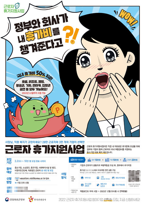 문화체육관광부와 한국관광공사는 2022년 근로자 휴가지원사업 참여 기업 및 근로자 모집을 2일부터 시작한다.근로자 휴가지원사업은 근로자가 20만 원을 적립하면 정부와 기업이 각 10만 원을 추가적립해 총 40만 원을 국내여행 경비로 쓸 수 있게 지원하는 제도로 2018년부터 매년 실시하고 있다.