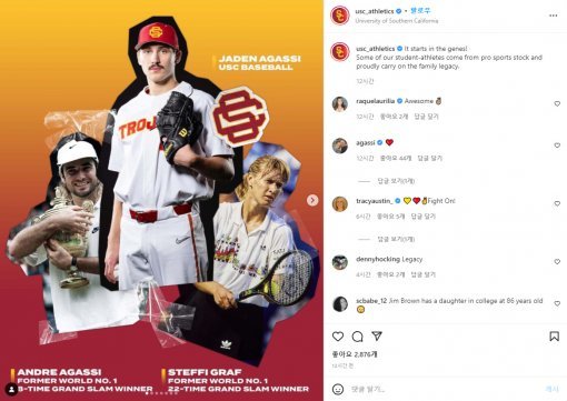 애거시-그라프 부부의 아들이 야구선수로 뛰고 있는 사실을 전한 USC 소셜미디어.