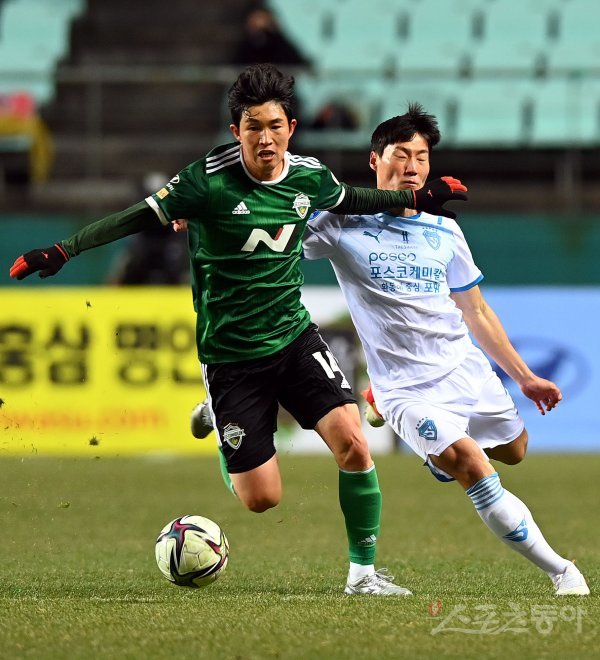 2일 전북 전주월드컵경기장에서 열린 ‘하나원큐 K리그1 2022’ 전북 현대와 포항 스틸러스의 경기에서 포항 이승기가 포항 선수와 볼 다툼을 벌이고 있다.
