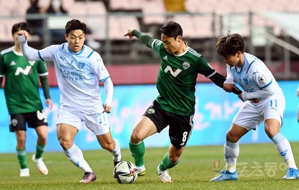 2일 전북 전주월드컵경기장에서 열린 ‘하나원큐 K리그1 2022’ 전북 현대와 포항 스틸러스의 경기에서 전북 배승호가 돌파할 때 포항의 반칙을 얻어내고 있다.