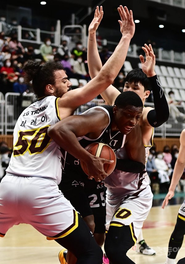 3일 경기도 수원KT소닉붐아레나에서 열린 ‘2021-2022 KGC 인삼공사 정관장 프로농구’ 수원 KT와 창원 LG의 경기에서 KT 라렌이 LG 수비를 뚫고 골밑 돌파하고 있다.
