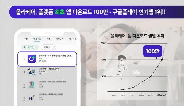 올라케어는 2월에 앱 누적 다운로드와 앱 이용자 및 누적진료 건수가 각 100만과 150만을 넘었다. 월간 활성 이용자(MAU) 수도 51만에 달하는 등 2월에 전월 대비 3배 이상 성장했다. 올라케어는 한국소비자포럼이 주관하는 ‘2022 대한민국 퍼스트브랜드’ 비대면 진료 플랫폼 분야에서 소비자 만족도 1위를 차지했고 지난주 구글 플레이스토어 인기 앱 1위에도 올랐다.