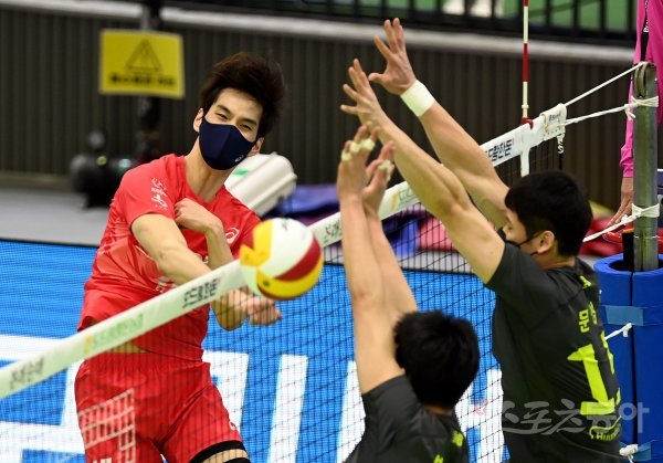 6일 경기도 수원체육관에서 ‘2021-2022 도드람 V리그’ 수원 한국전력과 천안 현대캐피탈의 남자부 경기가 열렸다. 한국전력 임성진이 현대캐피탈 블로킹을 피해 스파이크를 날리고 있다.
