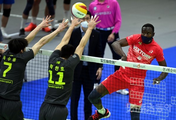 6일 경기도 수원체육관에서 ‘2021-2022 도드람 V리그’ 수원 한국전력과 천안 현대캐피탈의 남자부 경기가 열렸다. 한국전력 다우디가 현대캐피탈 블로킹을 피해 스파이크를 날리고 있다.