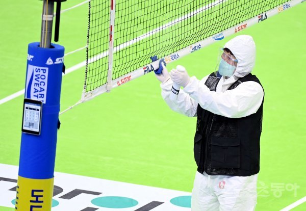 6일 경기도 수원체육관에서 ‘2021-2022 도드람 V리그’ 수원 한국전력과 천안 현대캐피탈의 남자부 경기가 열렸다. 1세트 종료 후 방역관계자가 코로나19 방역을 하고 있다.