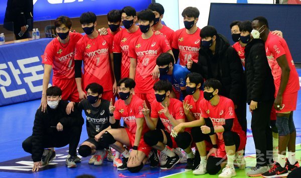 6일 경기도 수원체육관에서 ‘2021-2022 도드람 V리그’ 수원 한국전력과 천안 현대캐피탈의 남자부 경기가 열렸다. 한국전력 선수들이 현대캐피탈을 상대로 세트스코어 3-2로 승리한 뒤 코트에서 기쁨을 나누고 있다.