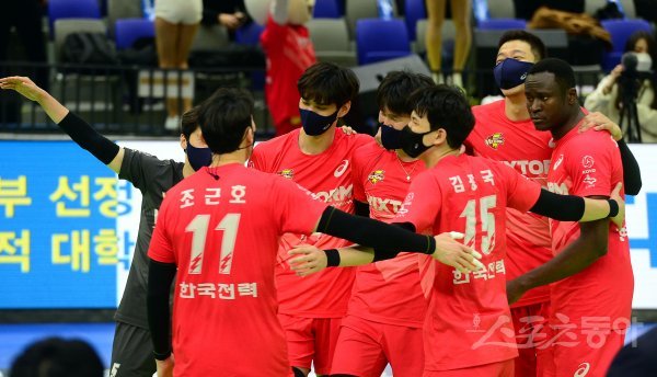 6일 경기도 수원체육관에서 ‘2021-2022 도드람 V리그’ 수원 한국전력과 천안 현대캐피탈의 남자부 경기가 열렸다. 한국전력 선수들이 현대캐피탈을 상대로 세트스코어 3-2로 승리한 뒤 코트에서 기쁨을 나누고 있다.