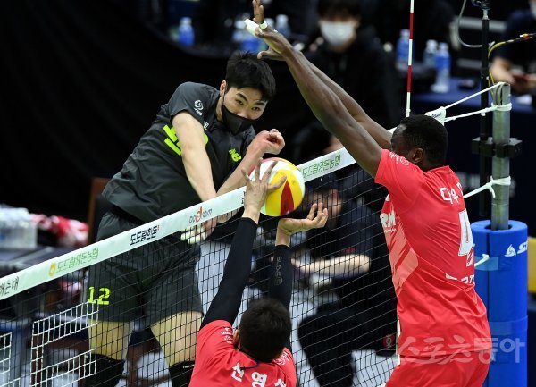 6일 경기도 수원체육관에서 ‘2021-2022 도드람 V리그’ 수원 한국전력과 천안 현대캐피탈의 남자부 경기가 열렸다. 현대캐피탈 전광인이 한국전력 블로킹을 피해 스파이크를 날리고 있다.