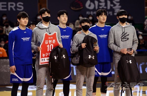 6일 잠실체육관에서 열린 ‘2021-2022 프로농구’ 삼성과 현대모비스 경기 하프타임 때 ‘제22회 김현준 농구 장학금’ 수상자 문유현(무룡고), 홍상민(경복고), 이동근(동아고)이 기념촬영을 하고 있다.