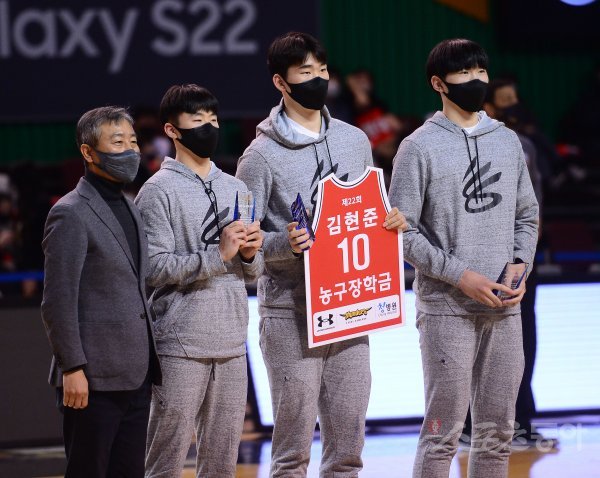 6일 잠실체육관에서 열린 ‘2021-2022 프로농구’ 삼성과 현대모비스 경기 하프타임 때 ‘제22회 김현준 농구 장학금’ 수상자 문유현(무룡고), 홍상민(경복고), 이동근(동아고)이 기념촬영을 하고 있다.