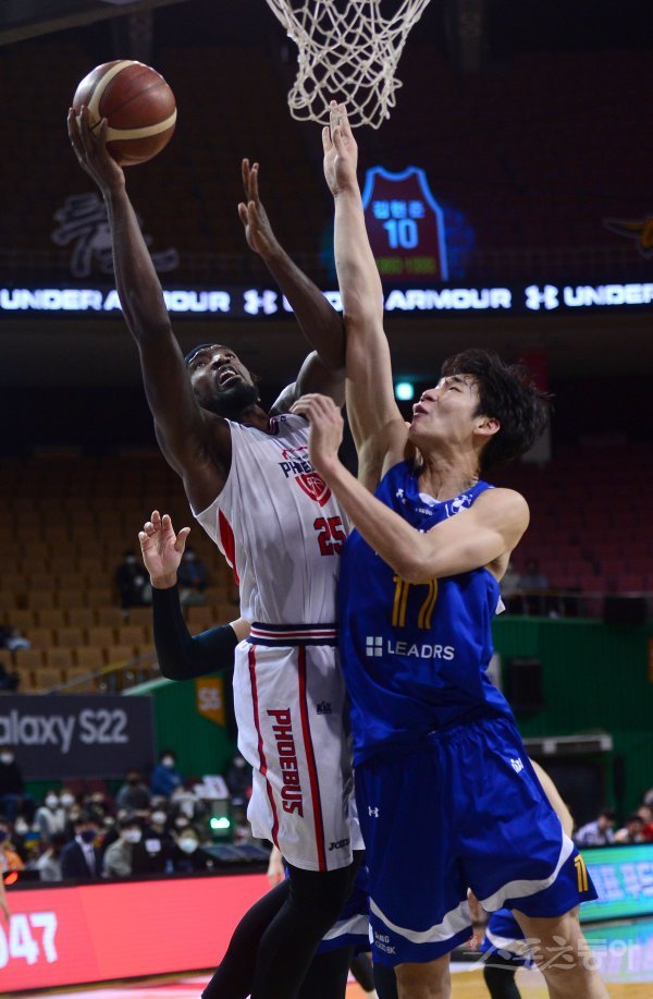 6일 잠실체육관에서 열린 ‘2021-2022 프로농구’ 삼성과 현대모비스 경기에서 현대모비스 라숀 토마스가 삼성의 수비를 뚫고 골밑 슛을 하고 있다.
