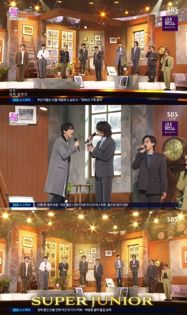슈퍼주니어는 6일 방송된 SBS '인기가요'에 출연해 스페셜 싱글 앨범 'The Road : Winter for Spring (더 로드 : 윈터 포 스프링)' 타이틀곡 'Callin' (콜린)' 무대를 공개했다.