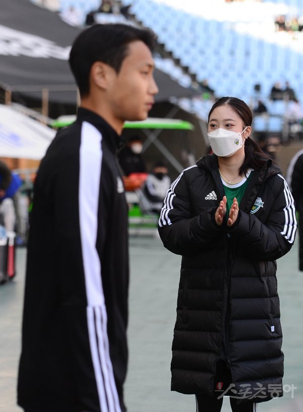 6일 전북 전주월드컵경기장에서 열린 ‘하나원큐 K리그1 2022’ 전북 현대와 울산 현대의 경기에 앞서 피겨 유영이 입장하는 선수들을 향해 손뼉을 치고 있다.