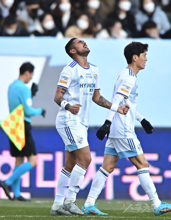 6일 전북 전주월드컵경기장에서 열린 ‘하나원큐 K리그1 2022’ 전북 현대와 울산 현대의 경기에서 전반전 울산 레오나르도가 선취골을 성공시킨 후 포효하고 있다.