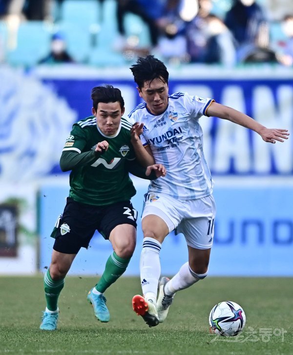 6일 전북 전주월드컵경기장에서 열린 ‘하나원큐 K리그1 2022’ 전북 현대와 울산 현대의 경기에서 전북 송민규와 울산 원두재가 몸싸움을 하고 있다.