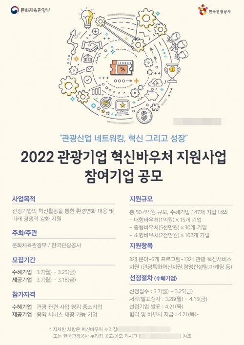 문화체육관광부와 한국관광공사는 ‘2022 관광기업 혁신바우처 지원’ 사업에 참여할 기업(수혜·제공)을 7일부터 모집한다.147개 수혜기업은 25일까지, 제공기업은 18일까지
