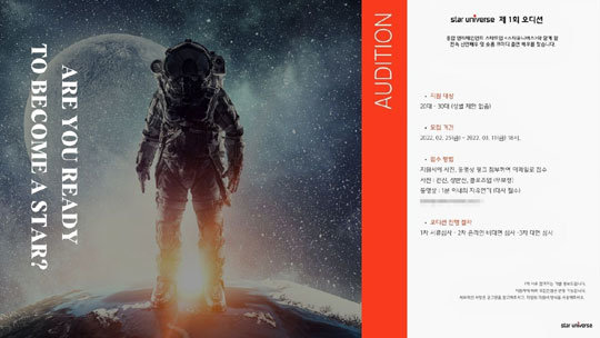 지난 2월 25일부터 서류 접수를 진행했으며, 오는 3월 11일까지 서류 마감이다. 20~30대 누구나 지원 가능하며, 1차 서류심사를 시작으로 2차 비대면 오디션, 3차 대면 면접 순으로 진행된다. 최종 합격자는 스타유니버스가 준비하는 오리지널 콘텐츠를 통해 데뷔의 기회가 주어지며, 이를 통해 다양한 외부 작업으로 확장, 빠르게 성장할 수 있도록 적극 지원할 예정이다.