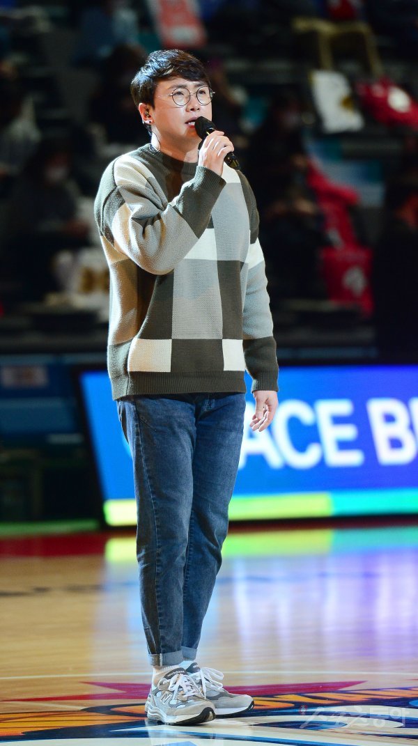 7일 고양체육관에서 열린 ‘2021-2022 프로농구’ 5위 오리온과 6위 LG 경기 전 가수 모세가 하프타임 때 공연을 하고 있다.