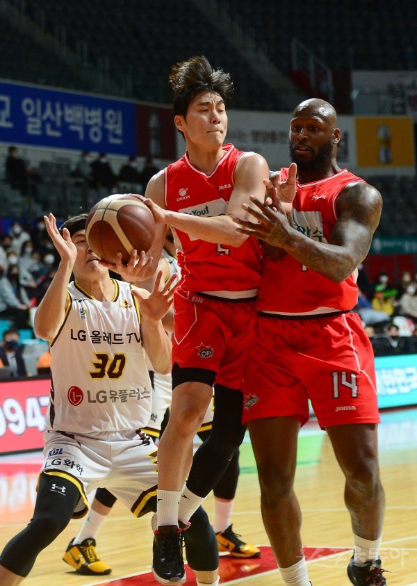 7일 고양체육관에서 열린 ‘2021-2022 프로농구’ 5위 오리온과 6위 LG 경기에서 오리온 한호빈이 리바운드 볼을 잡고 있다.