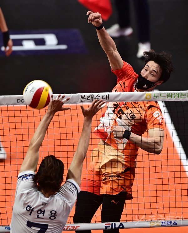 7일 경기도 안산상록수체육관에서 열린 ‘2021~2022 도드람 V-리그’ 남자부 안산 OK금융그룹과 서울 우리카드의 경기에서 OK금융그룹 최홍석이 상대 리시브가 네트를 넘어오자 스파이크하고 있다.