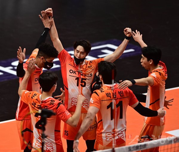 7일 경기도 안산상록수체육관에서 열린 ‘2021~2022 도드람 V-리그’ 남자부 안산 OK금융그룹과 서울 우리카드의 경기에서 OK금융그룹 선수들이 득점에 성공한 후 기쁨을 나누고 있다.