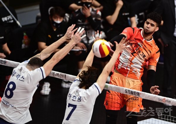 7일 경기도 안산상록수체육관에서 열린 ‘2021~2022 도드람 V-리그’ 남자부 안산 OK금융그룹과 서울 우리카드의 경기에서 OK금융그룹 레오가 우리카드 블로커 앞에서 스파이크를 하고 있다. 안산 | 주현희 기자 teth1147@donga.com