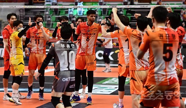 7일 경기도 안산상록수체육관에서 열린 ‘2021~2022 도드람 V-리그’ 남자부 안산 OK금융그룹과 서울 우리카드의 경기에서 우리카드에 세트스코어 3-2로 승리를 거둔 OK금융그룹 선수들이 기쁨을 나누고 있다.