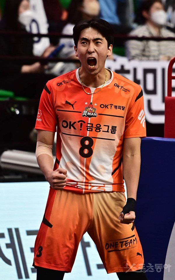 7일 경기도 안산상록수체육관에서 열린 ‘2021~2022 도드람 V-리그’ 남자부 안산 OK금융그룹과 서울 우리카드의 경기에서 OK금융그룹 차지환이 득점에 성공한 후 포효하고 있다.