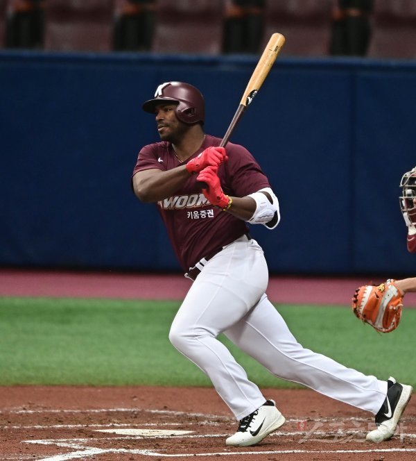 9일 서울 고척스카이돔에서 열린 키움 히어로즈의 자체 청백전에서 3회초 1사 1루 원정 팀 푸이그가 내야 땅볼을 치고 있다.