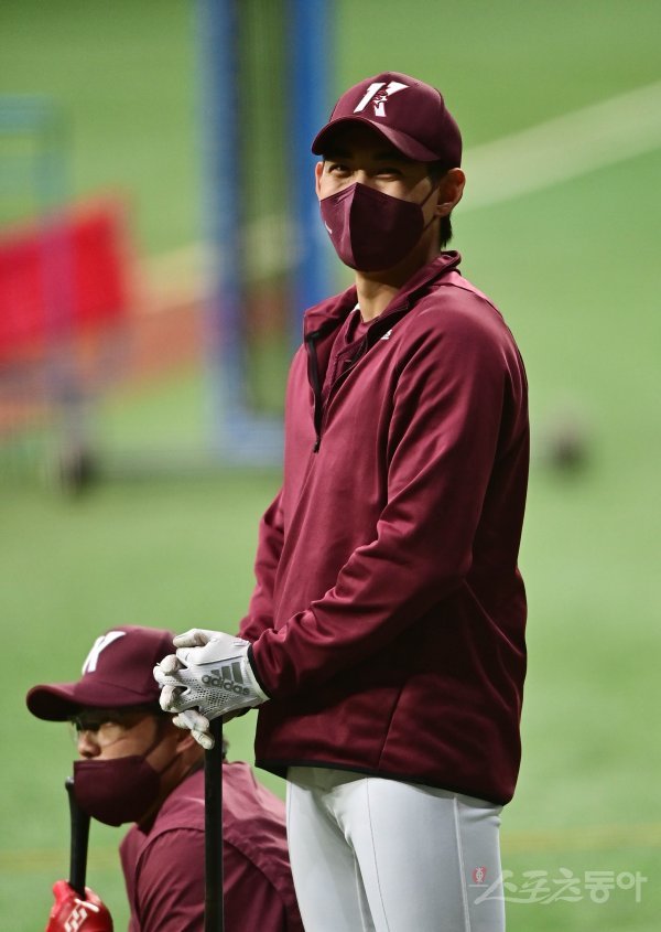 9일 서울 고척스카이돔에서 열린 키움 히어로즈의 자체 청백전에 앞서 키움 이정후가 동료와 이야기하고 있다.