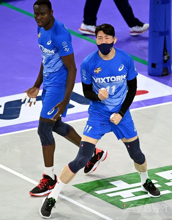 9일 인천 계양체육관에서 ‘2021-2022 도드람 V리그’ 인천 대한항공과 수원 한국전력의 남자부 경기가 열렸다. 한국전력 조근호가 가로막기를 성공시킨 후 환호하고 있다.
