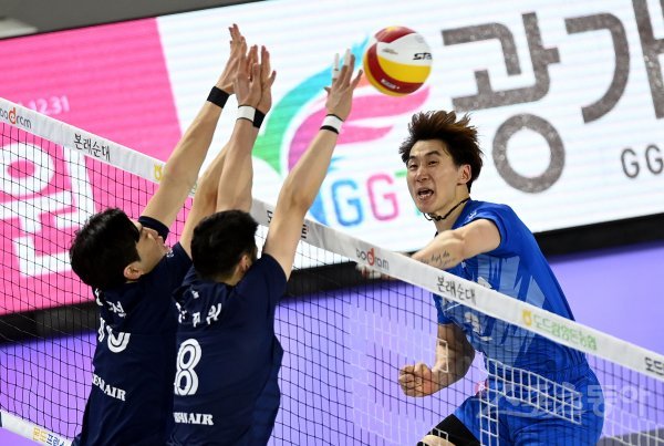 9일 인천 계양체육관에서 ‘2021-2022 도드람 V리그’ 인천 대한항공과 수원 한국전력의 남자부 경기가 열렸다. 한국전력 박철우가 대한항공 블로커를 피해 스파이크를 날리고 있다.