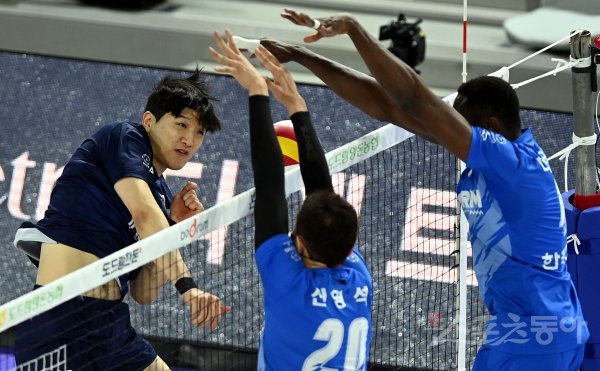 9일 인천 계양체육관에서 ‘2021-2022 도드람 V리그’ 인천 대한항공과 수원 한국전력의 남자부 경기가 열렸다. 대한항공 정지석이 한국전력 블로커를 피해 스파이크를 날리고 있다.