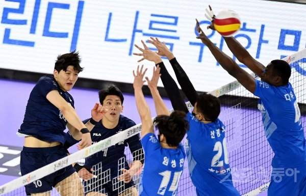 9일 인천 계양체육관에서 ‘2021-2022 도드람 V리그’ 인천 대한항공과 수원 한국전력의 남자부 경기가 열렸다. 대한항공 정지석이 한국전력 블로커를 피해 스파이크를 날리고 있다.