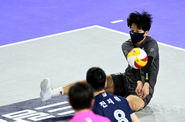 9일 인천 계양체육관에서 ‘2021-2022 도드람 V리그’ 인천 대한항공과 수원 한국전력의 남자부 경기가 열렸다. 대한항공 박지훈이 수비를 펼치고 있다.