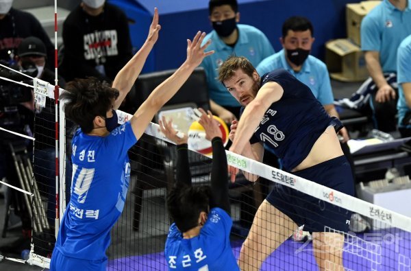 9일 인천 계양체육관에서 ‘2021-2022 도드람 V리그’ 인천 대한항공과 수원 한국전력의 남자부 경기가 열렸다. 대한항공 링컨이 한국전력 블로커를 피해 스파이크를 날리고 있다.