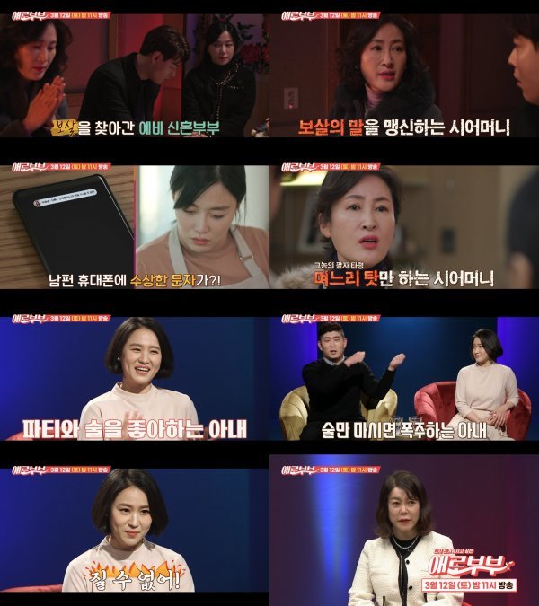 남편의 정신 나간 짓에도 며느리를 질타하는 시어머니 때문에 고통받는 아내의 사연을 다룬 ‘애로드라마’, 술 마시면 폭주하는 반전매력의 아내와 남편의 설전을 다룬 ‘속터뷰’는 12일 토요일 밤 11시 SKY채널과 채널 A에서 방송되는 본격 19금 부부 토크쇼 ‘애로부부’에서 공개된다.