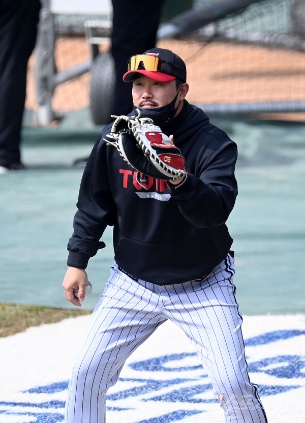 10일 서울 잠실야구장에서 LG 트윈스 훈련을 가졌다. 이호준 코치가 포수 글러브를 끼고 훈련을 돕고 있다