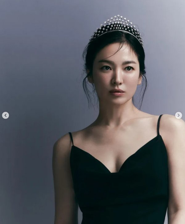 송혜교는 9일 자신의 인스타그램을 통해 앰버서더로 활동 중인 주얼리 브랜드와 함께한 화보를 공개했다. 사진 속 그는 가슴라인이 깊이 파인 블랙 드레스를 입고 포즈를 취했다. 다른 주얼리 없이 화려한 왕관을 매치, 우아하고 기품 있는 자태를 뽐냈다.