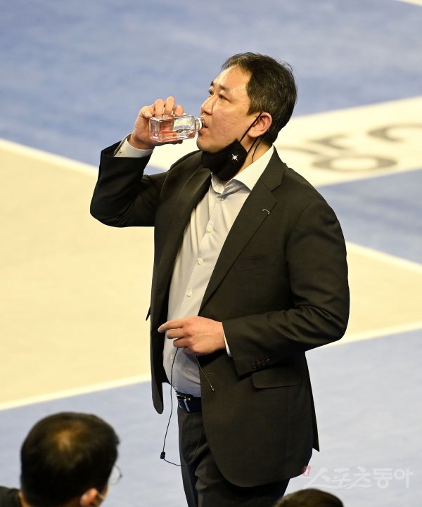 10일 천안 유관순체육관에서 열린 ‘2021~2022 도드람 V-리그’ 남자부 현대캐피탈과 KB손해보험 경기에서 현대캐피탈 최태웅 감독이 팀 선수가 부상을 당하자 물을 마시고 있다.