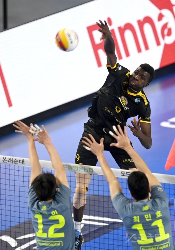 10일 천안 유관순체육관에서 열린 ‘2021~2022 도드람 V-리그’ 남자부 현대캐피탈과 KB손해보험 경기에서 KB손해보험 케이타가 현대캐피탈의 블로킹 사이로 스파이크를 날리고 있다.