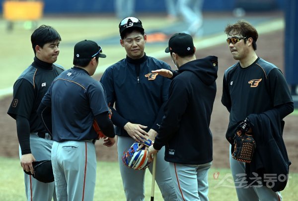 12일 대구 삼성라이온즈파크에서 ‘2021 신한은행 SOL KBO리그’ 삼성 라이온즈와 한화 이글스의 시범경기가 열렸다. 경기에 앞서 한화 노시환, 하주석, 장민재가 코치와 이야기를 나누고 있다. 대구 | 김민성 기자 marineboy@donga.com